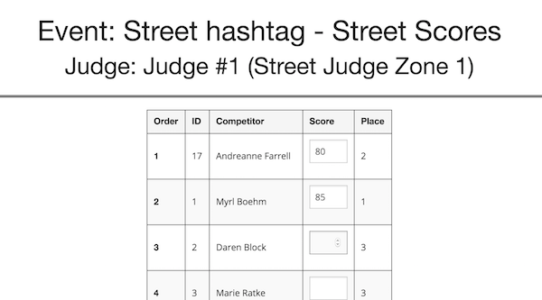 The Event director can configure a number of judge users for each of 3 different "zones". Each judge will be able to enter results