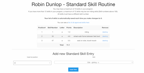 Enable the advanced feature of "Standard Skill" on an Event, and any user who signs up for that event will be presented with the ability to enter their standard skill routine.